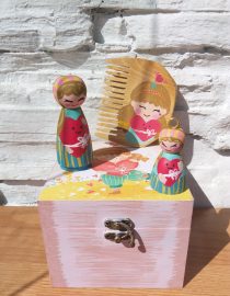 دارای جعبه با عکس دختر به همراه یک ادمک و جای کیلیدی و شانه با طرح روی جعبه.